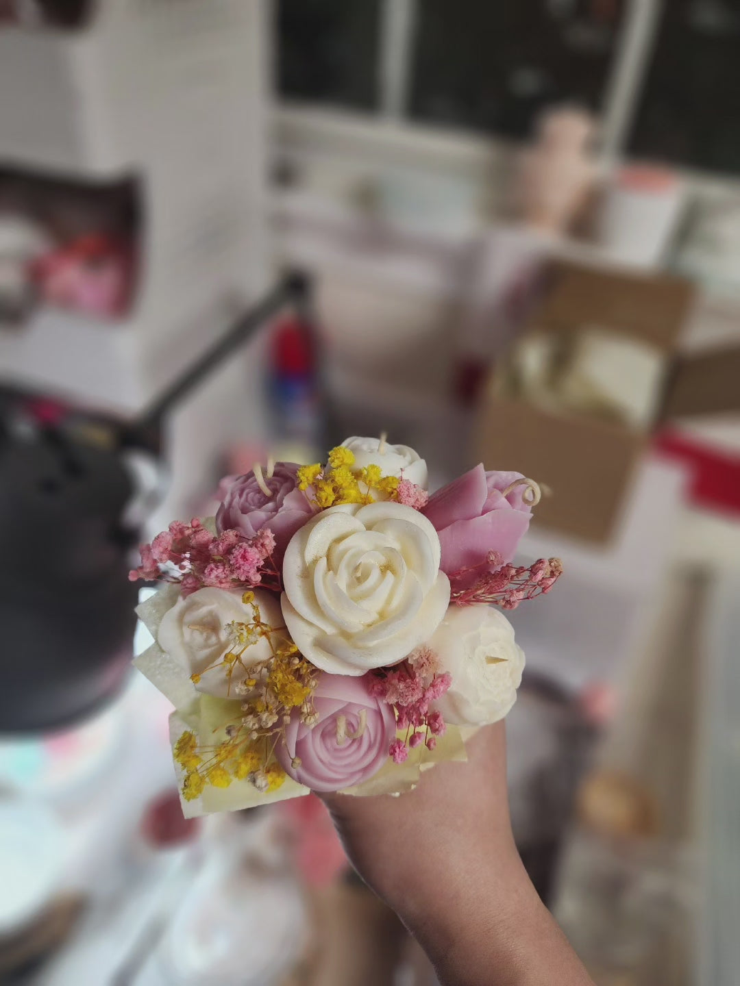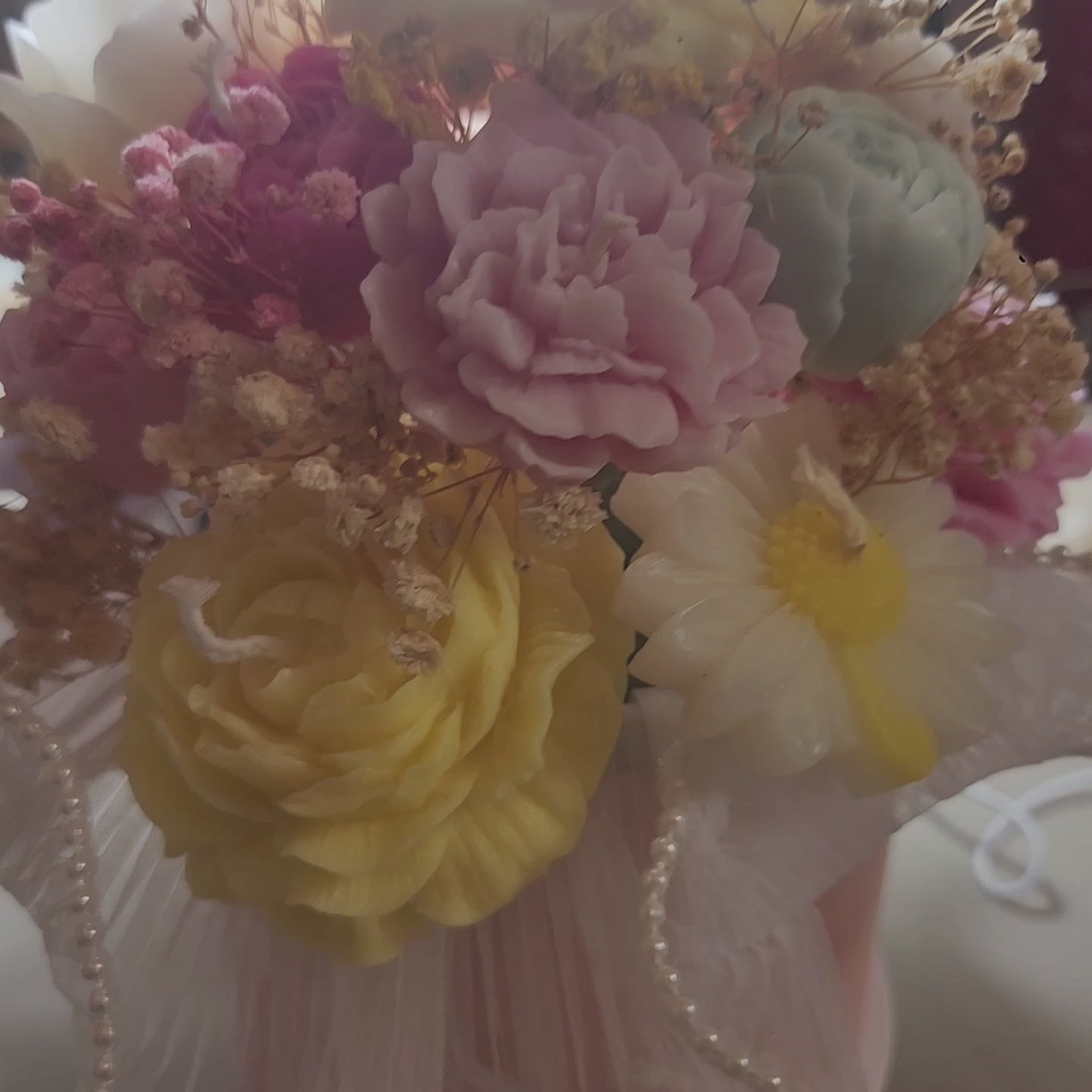 A stunning handmade gift that blends beauty and elegance. Each candle is sculpted to mimic delicate rose petals and nestled in a bouquet of soft pink and ivory dried flowers. Wrapped with care, this bouquet is perfect for romantic gestures, special events, or thoughtful customer gifts.
